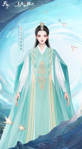 青衫烟雨客,似是故人来。纪云禾同款时装将翠色长衫笼罩在素白内衬之上,两束金色丝绦自肩头流泻而下,胸前的暗金花纹精美繁复,流转着熠熠光华。搭配上随风拂动的轻纱下摆,仙气飘逸,又不失清纯可人。