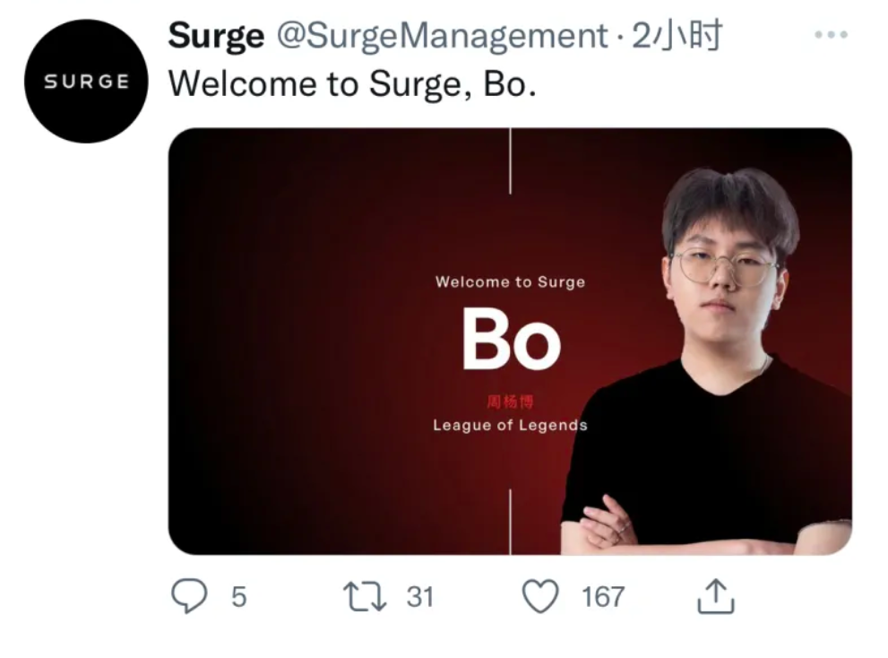 具体的官宣消息如下,海外选手经纪公司官宣:欢迎加入Surge,Bo!配图中正是前FPX打野Bo,中文名都是周杨博,所以Bo应该是将自己的选手合约交给了Surge来处理,而Surge正是经常为欧美赛区输送选手的经纪公司。