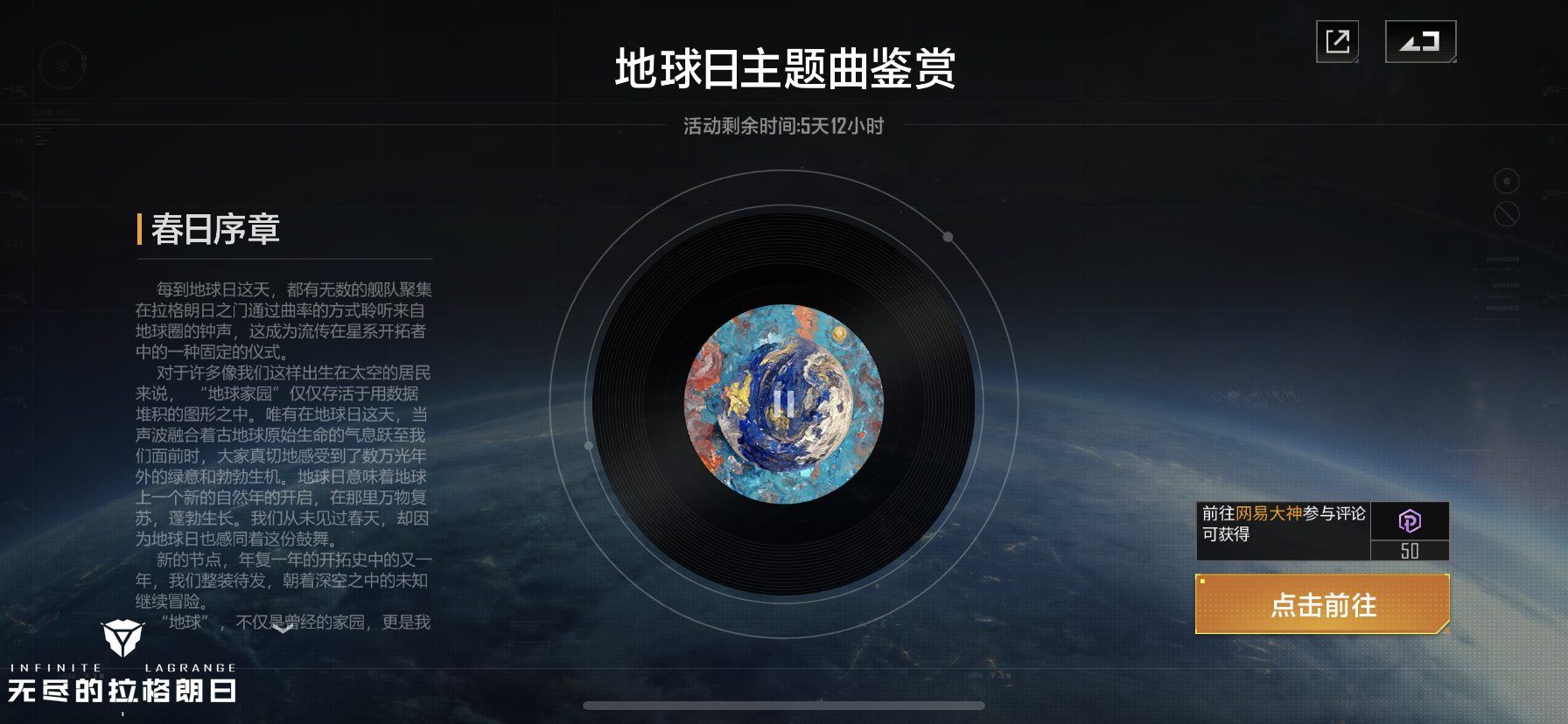 每个地球年,地球圈政府都会根据当年地球日的主题,发行一张全新的金唱片,这已成为了世界地球日的主要文化活动之一。这些唱片备受地球文化爱好者的青睐。今年地球日期间,全新主题乐章《春》将正式发行,欢迎开拓者们前来品鉴。