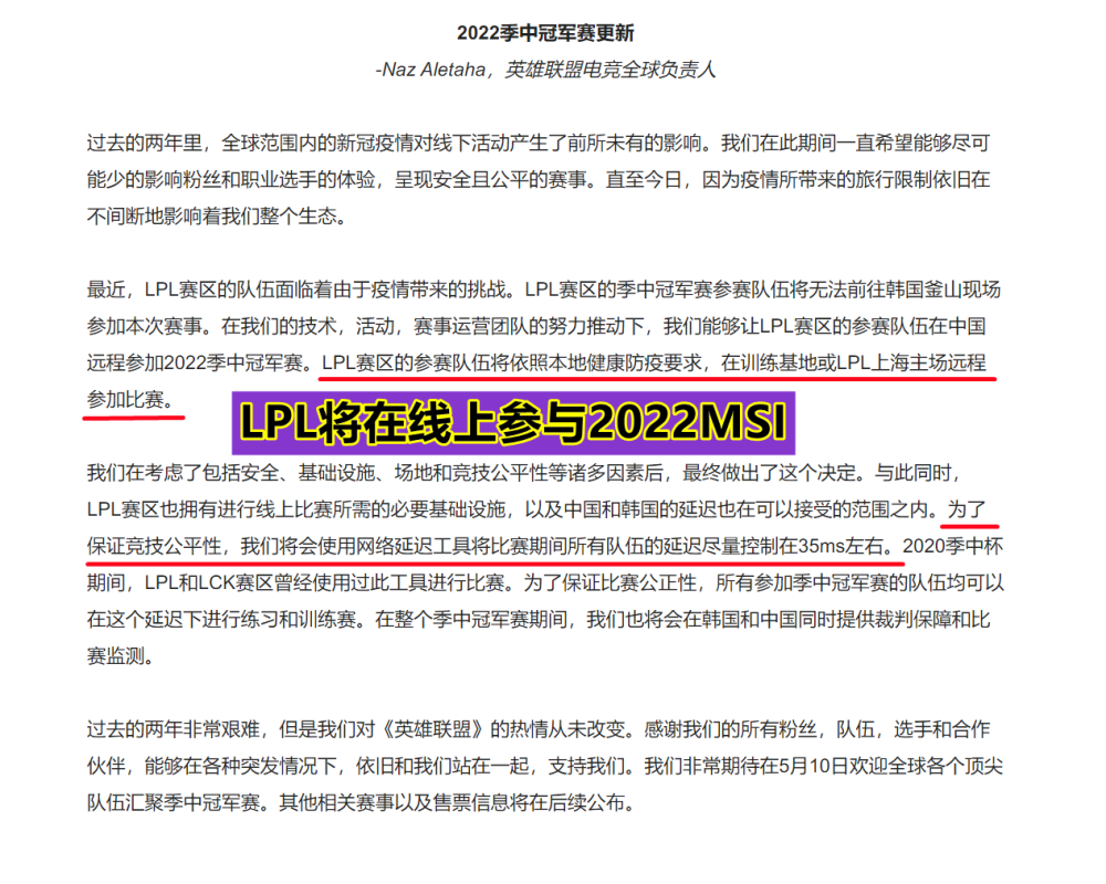 在拳头得知LPL的队伍没办法去往韩国参与MSI之后,拳头似乎也不想让LPL队伍放弃,毕竟最近几年的MSI,几乎都是LPL、LCK这两个赛区的队伍在神仙打架,一旦LPL缺席,那么MSI基本上没什么看头,所以拳头也是决定让LPL赛区的队伍在线上或者LPL上海主场参与比赛,这一消息公布出来之后,也是引起了大家的热议,。