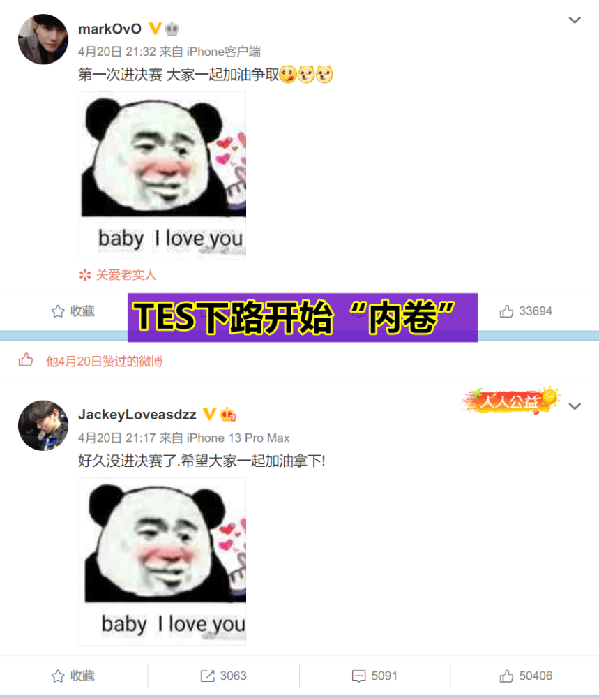 赢下了比赛后,选手们作为参与者,自然是相当开心,然而万万没想到,TES的下路就这样内卷了起来,在大家接连发出了晋级决赛的加油微博之后,刚加入TES不久的Mark也是赶紧跟着发了起来。
