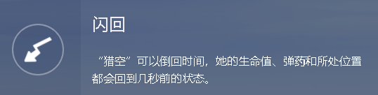 E技能:闪回,猎空的时间回溯装置可以让猎空回到几秒前的状态,生命值,弹药等都会回到前几秒的状态,利用这个技能可以在敌方人群中杀死对方再安然无恙的返回。