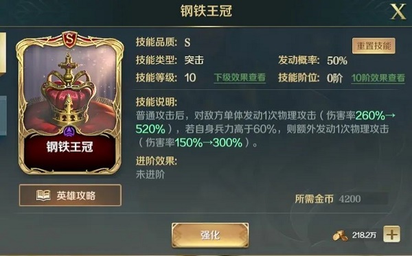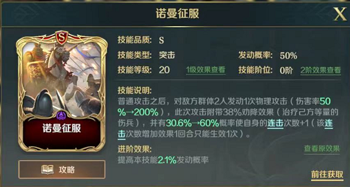 单体突击伤害,秒人后全体高额兵力恢复,保证腓特烈的自带技能二段伤害。
