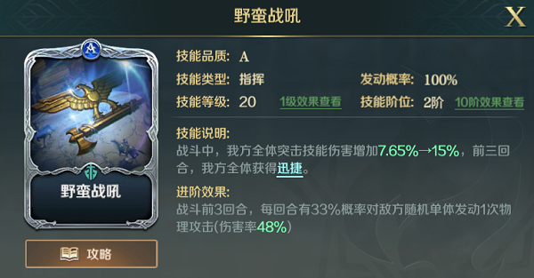 提供高额的单体伤害,若能始终能够保持兵力高于60%,在楔型骑兵阵的加持下,则会是团队中最佳的秒人能手。