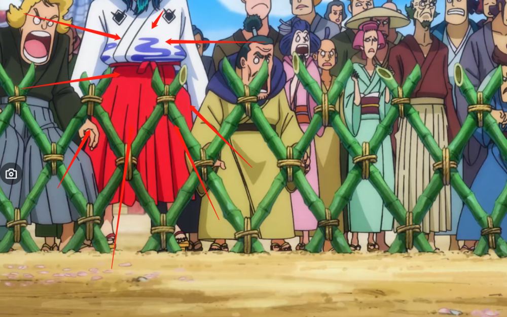 在御田以及家臣被绑上行刑台的时候,细心的观众应该有留意到,在某路人甲掉进滚烫的釜中爬出来摔在地上的时候,一个上身穿着白色和服,下身穿着红色长裤的神秘人出现了。其实有看过漫画的小伙伴应该认出来了,她就是凯多的“儿子”大和。当年只有八岁的她,就是看到了光月御田英勇就义,为了保护伙伴在滚烫的釜中坚持了足足一个小时,这英雄气概令大和心向神往,最终成为了御田的忠实粉丝。