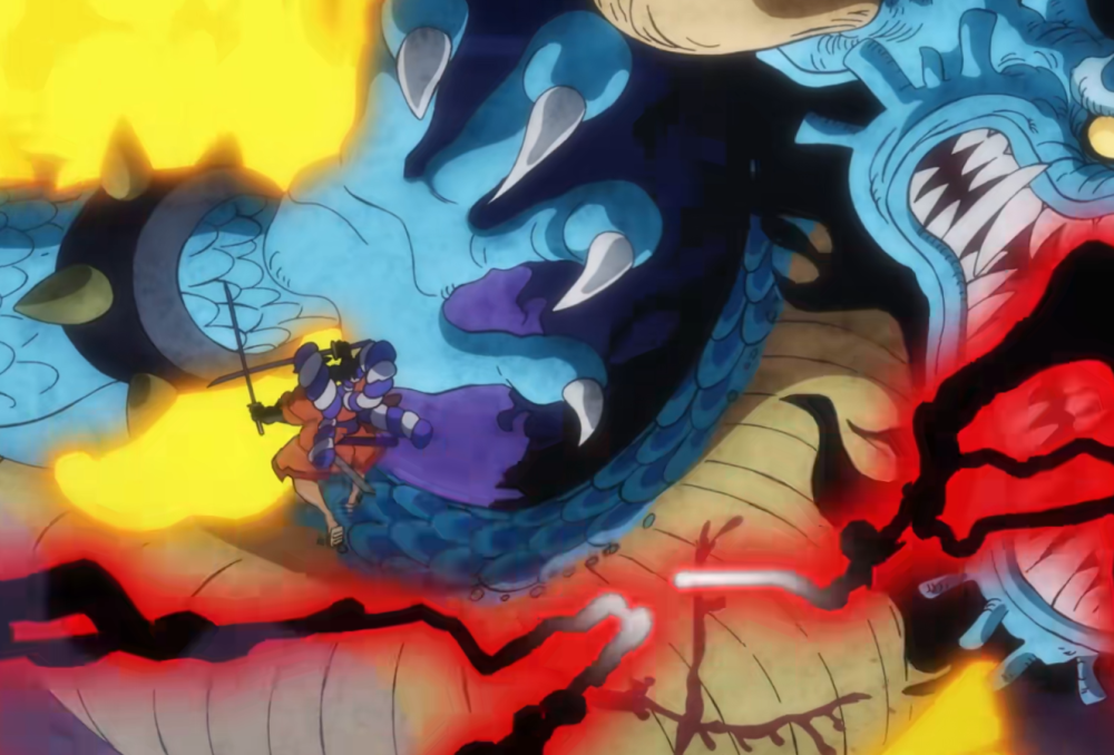 在这一集中,御田与赤鞘九侠一同前去迎战凯多的百兽海贼团,他们10人加上突然加入的小忍,一路过关斩将杀到了凯多面前,两位顶级强者交手,这场面那叫一个精彩。虽然御田实力强横,掌握了高超的武装色霸气,以及一手双刀流已经出神入化,但是面对百兽凯多,还是力所不逮,整体处于劣势。