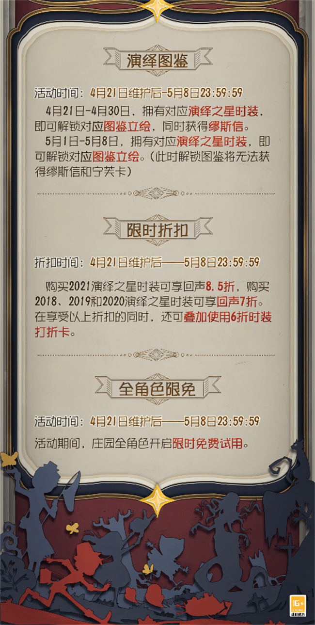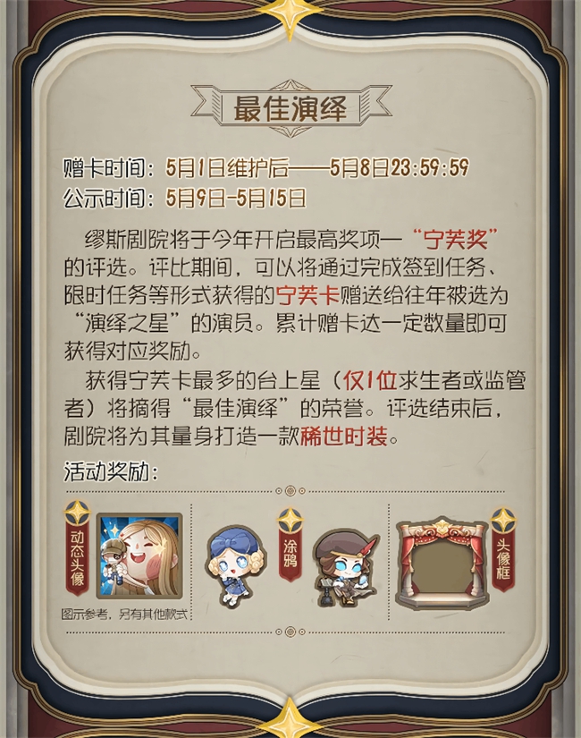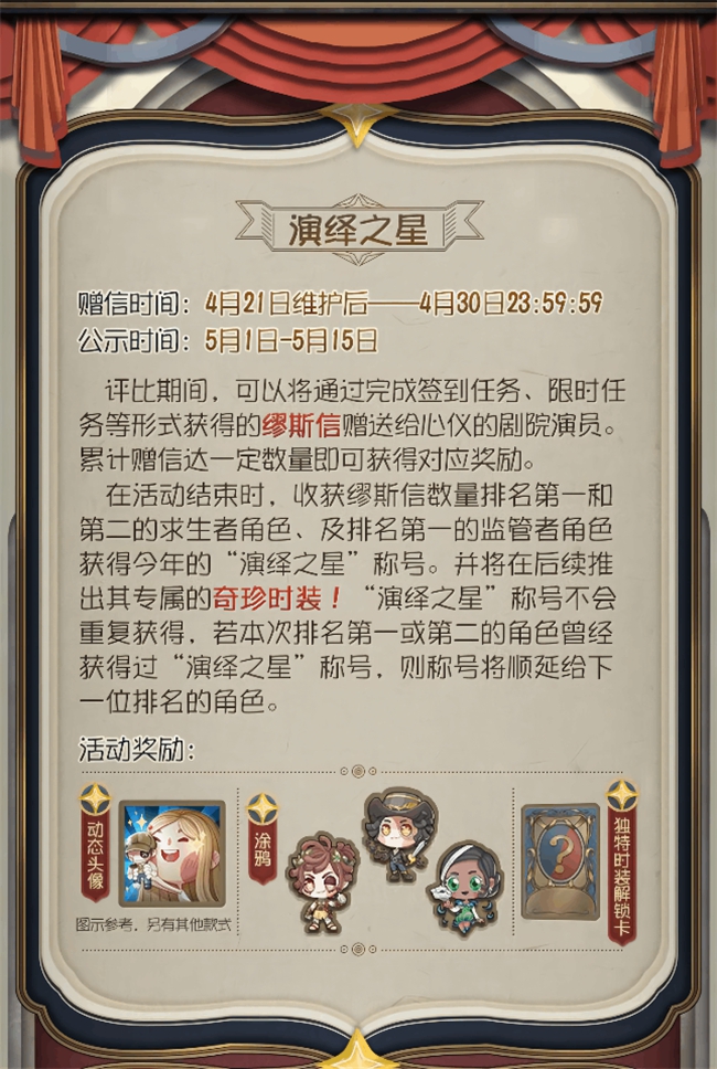 4月21日维护后至4月30日,玩家们通过参与签到任务、限时任务等均可获得数量不等的缪斯信,将缪斯信赠送给心仪的角色后,便可助力TA角逐本年度的演绎之星奖项。评选结束时,获得缪斯信数量排名第一的监管者角色和排名前二的求生者角色将荣膺“演绎之星”称号,并将获得专属的演绎之星时装!