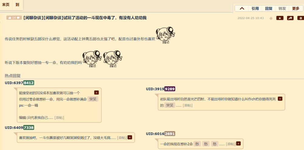 从这个角度来说,其实战斗类型的活动,是最适合策划上演骗氪活动的地方了。比如说一斗上线的时候,深渊里有专门的buff。一斗那是真的,用脚打都能12层(含一定夸张成分)。但是随着深渊环境改变,一斗的出场率,讨论度也是肉眼可见的降低。