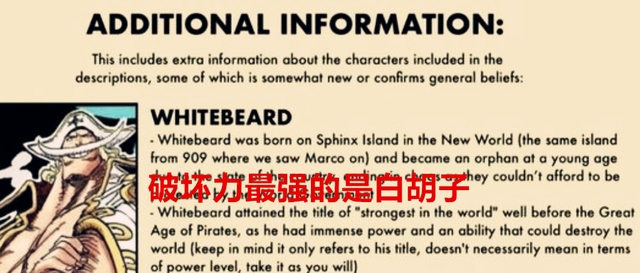 白胡子出生在新世界的狮身人面像岛,在大海贼时代开启之前就有世界最强的称号,但是这个最强是指他的能力能够毁灭世界,并不是说他的个人实力高出罗杰卡普等人。这里的意思就是说,白胡子的震震果实,是全海贼中,破坏能力最强的,基本上没有哪一颗果实可以造成如此大规模的伤害,或许也正是这一点原因,黑胡子死都要抢走白胡子的震震果实。