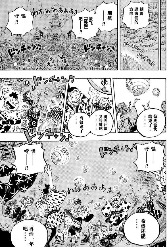而另一边和之国的人民已经开始了祭典,他们已经看淡了生死,无论路飞与凯多的胜负如何,大家都衷心地对明天抱有期望,对又活过一年心存感恩。