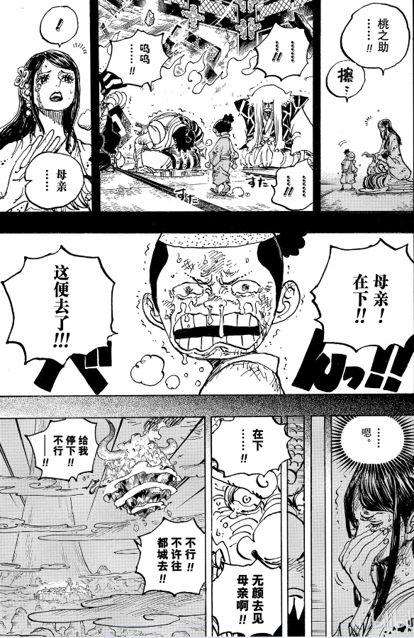 懦弱的桃之助不停的说自己不行,然后为了加强他,尾田放出了几页回忆杀,让桃之助回想起自己的责任与母亲寄托于自己身上的希望。