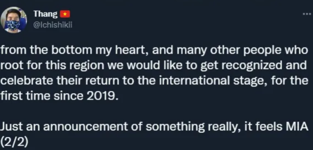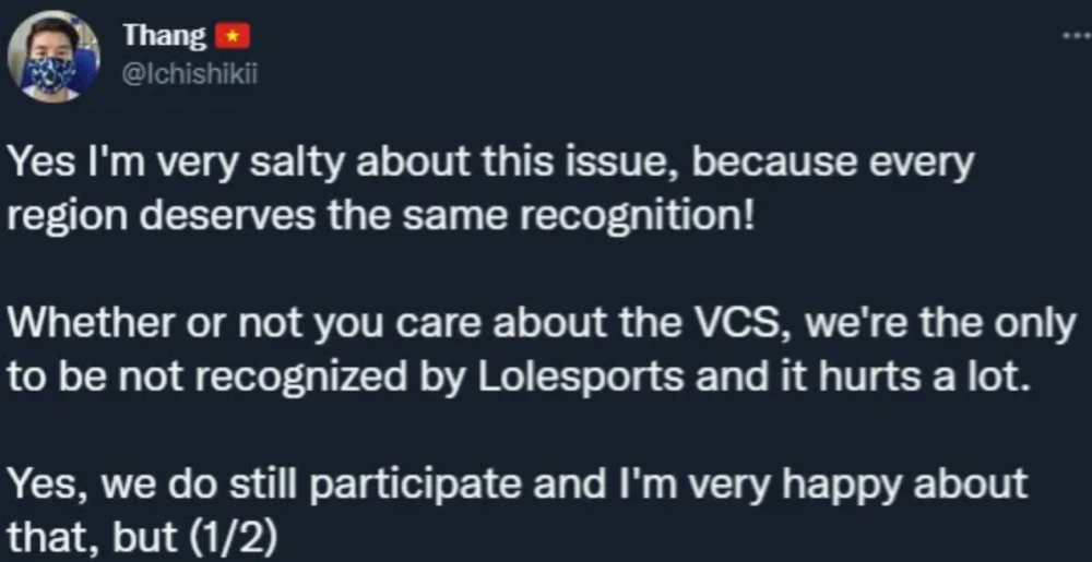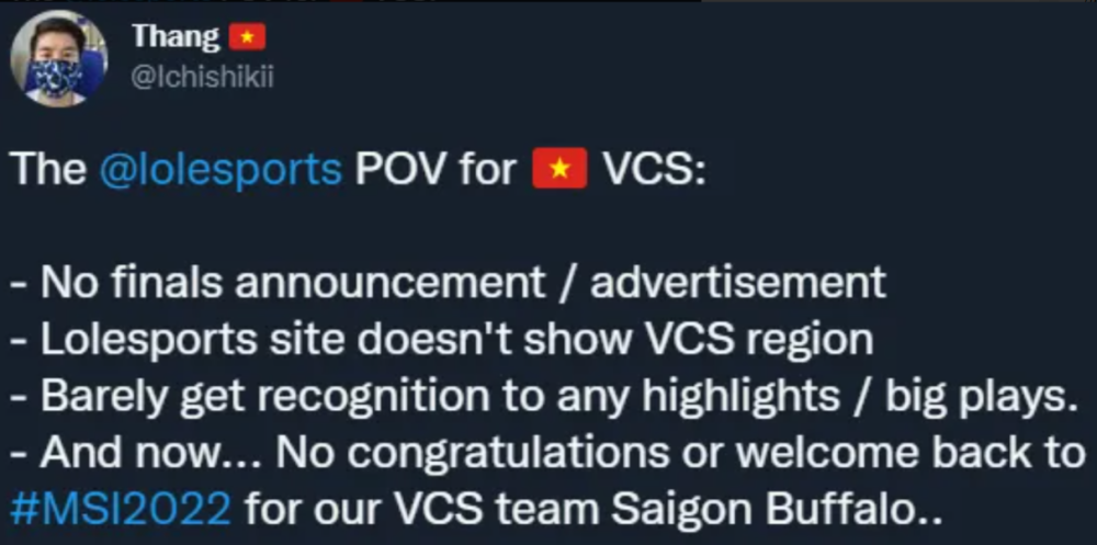 对此越南媒体非常不满,在推特上直言道“我们依然会参加本次MSI,但我们希望拳头能尊重我们越南赛区”而后越南媒体对此补充道“拳头对越南赛区不重视是显而易见的,首先是在MSI宣传上拳头就出现了巨大的差异对待,拳头对于其他赛区的比赛非常关注,这能从拳头的官网上看的出来,每一场春季赛决赛拳头甚至四强拳头都会做出足够多的预热,并且也会将完整录像放到官网上,还会配上精彩操作的剪辑,但我们越南赛区完全没有”