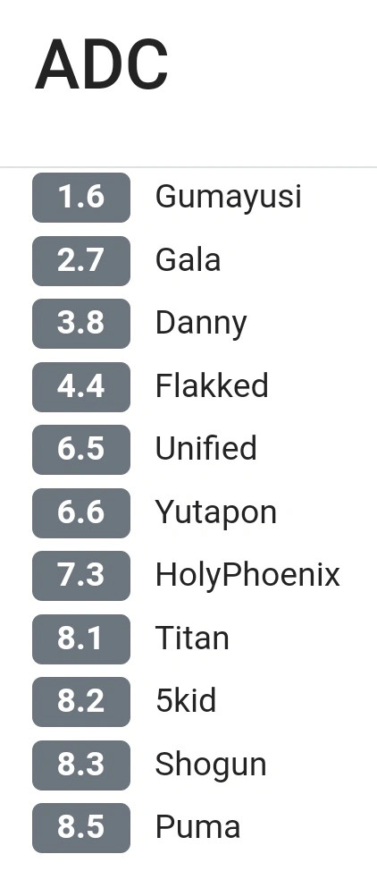 ADC位置也是一样,Gumayusi得票率最高排名第一,还是T1的队员霸榜。第二名才是RNG的下路Gala,第三名是Danny,第四名是Flakked,第五名是Unified。
