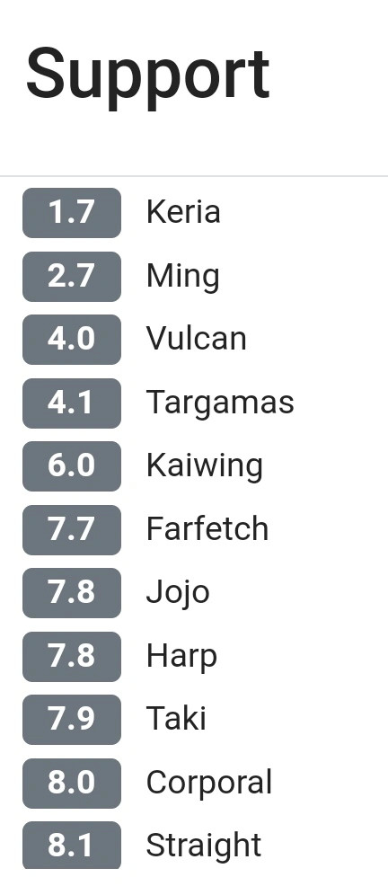 辅助位置第一名是T1的Keria,第二名是RNG的Ming,第三名是Vulcan,第四名是Targamas,第五名是Kaiwing。