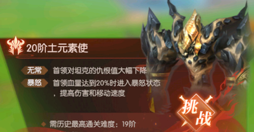 暴怒:当BOSS血量低于20%,就会暴怒,伤害和防御都变增加。需要T开爆元或者用玄武进行扛伤,DPS全力打输出。