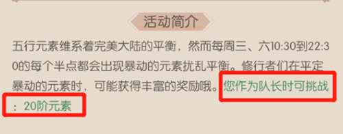 2、五行之序元素,每周有两天开放,而且在当日内,开启的次数和时间都很长。活动快开启时,提前来到相应阶级元素的场景中节省时间。