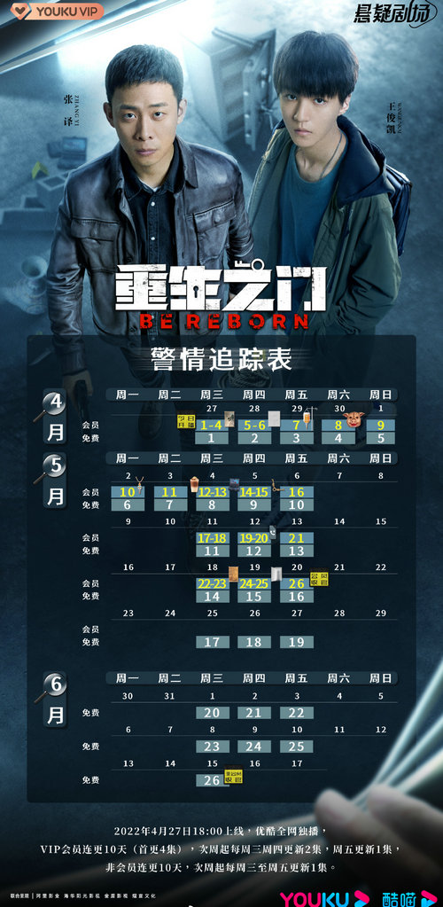 由杨冬执导,张译、王俊凯领衔主演,潘粤明、张国强情出演的盗窃题材悬疑剧《重生之门》于今晚在优酷悬疑剧场全网独播,共计26集。下面是《重生之门》追剧日历及详细更新时间表。