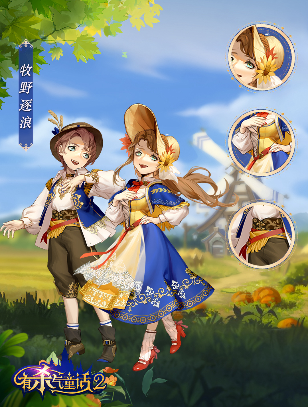 服饰“牧野逐浪”整体呈金黄与深蓝色,巧妙的搭配完美突显西方中世纪的劳作生活!女性的复古时代感长裙搭配随风飘逸的红色丝带,帽檐上的向日葵与枫叶更显别致;男性的田野风夹克,腰间红色丝带缠绕着金黄麦穗,预示着秋收时节五谷丰登,细节拿捏的满满~