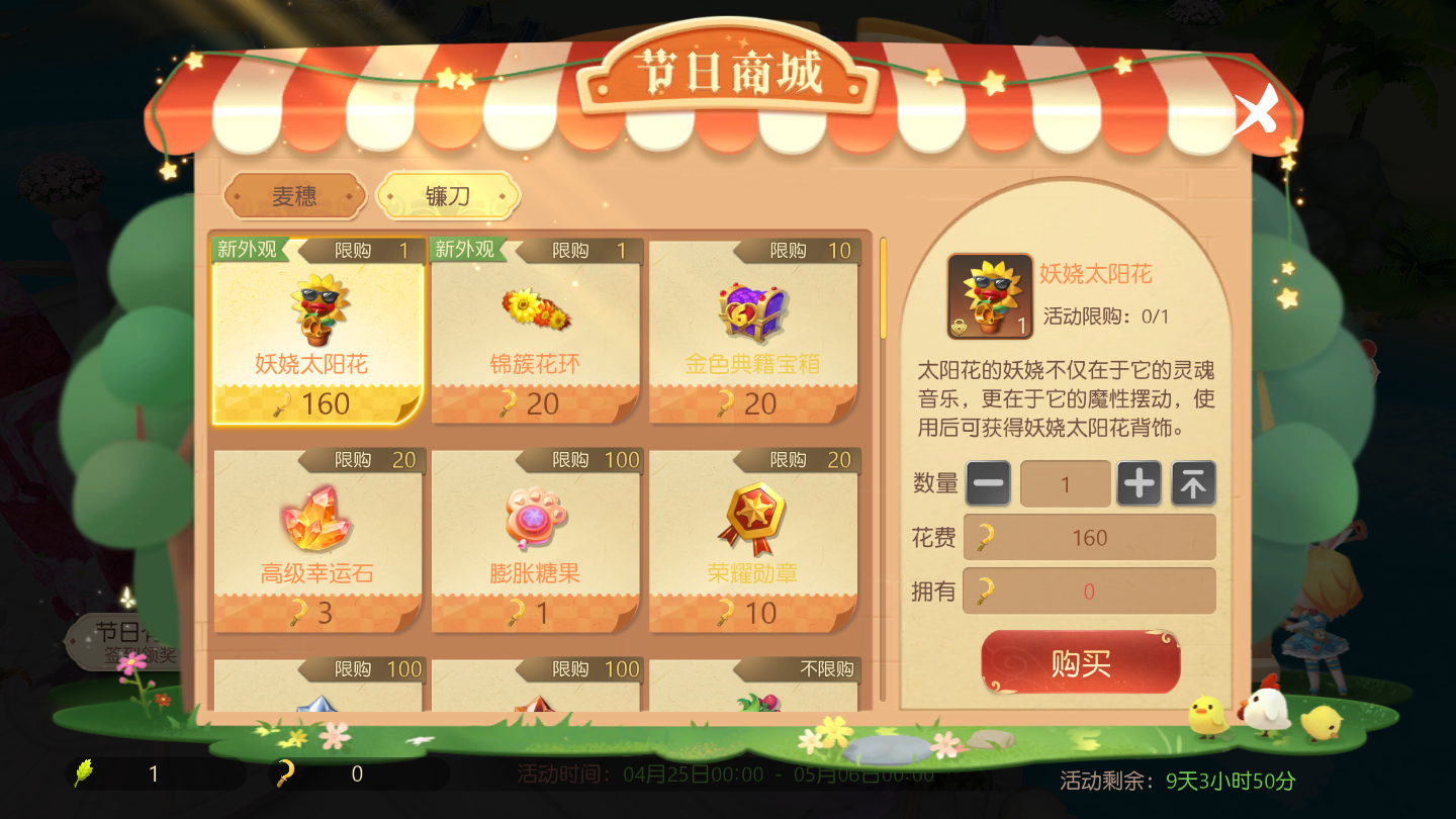 【奖励说明】:使用“麦穗”代币可兑换“欣欣向荣”头像框与气泡框等好礼;使用“镰刀”代币可兑换劳动节限定背饰“妖娆太阳花”,头饰“锦簇花环”等道具!