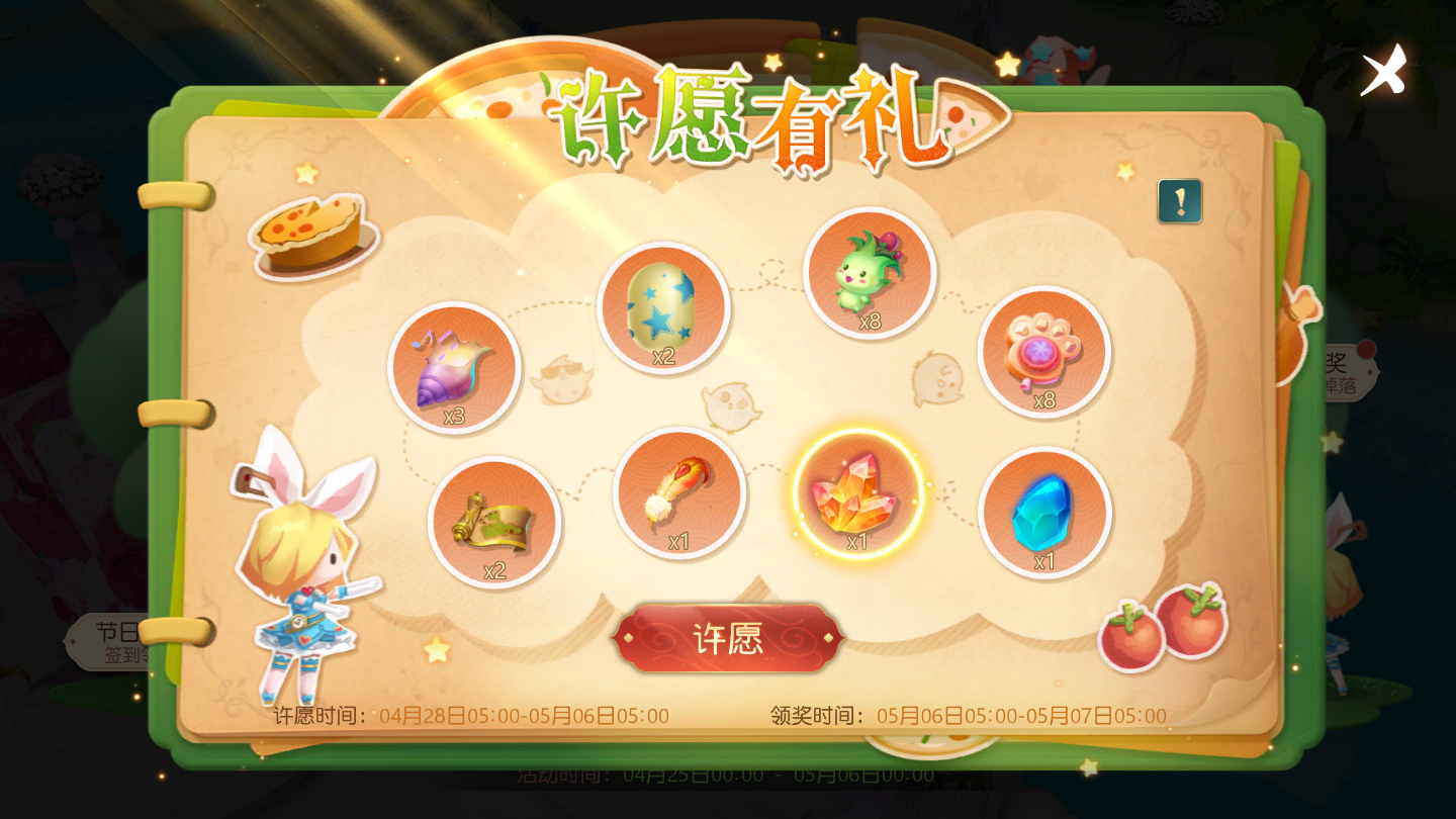 【奖励说明】:冒险者可以通过许愿每天选择一种物品,在指定领取时间内领取每天许愿的道具!