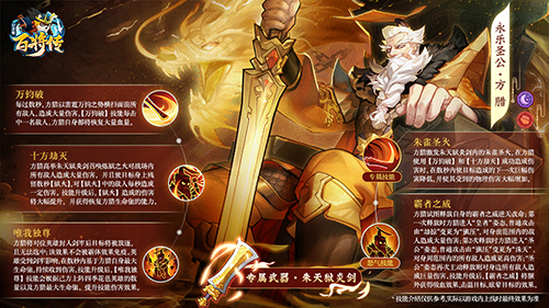 当方腊装备上专属武器【朱天狱炎剑】时,方腊将会获得【朱雀圣火】这一专属技能。【朱雀圣火】可以让【万钧破】、【释放劫灭】两个技能对目标造成伤害后,对目标大幅削弱。