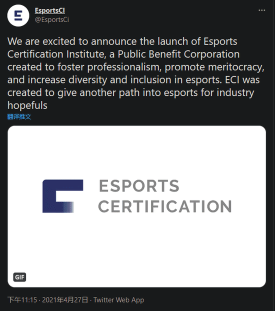 随着电竞行业的发展,全世界许多求职者都希望进入这个行业,但是电竞行业并没有明确的就业标准。为了解决这个问题ECI推出了一个“电竞‘官方’认证证书”。该机构此举获得了包括NRG、Gen.G和EG电竞团队公司CEO的支持与帮助。