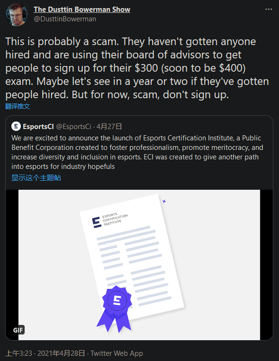 《守望先锋》专业选手Dustin “Dogman” Bowerman就在推特上发文表示这简直就是诈骗:“他们还没有让任何人得到工作,他们正在利用自己的顾问委员会试图让人报名参加需要300美元(很快就要400美元)报名费的考试。也许我们等个一两年看看他们有没有帮助别人找到工作。但就现在来说这就是一场骗局,不要报名。”