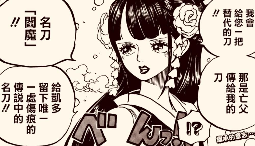 要知道早在955话,日和就以【唯一在凯多身上留下伤疤】的名刀【阎魔】赠予索隆,来替换和之国国宝【秋水】。