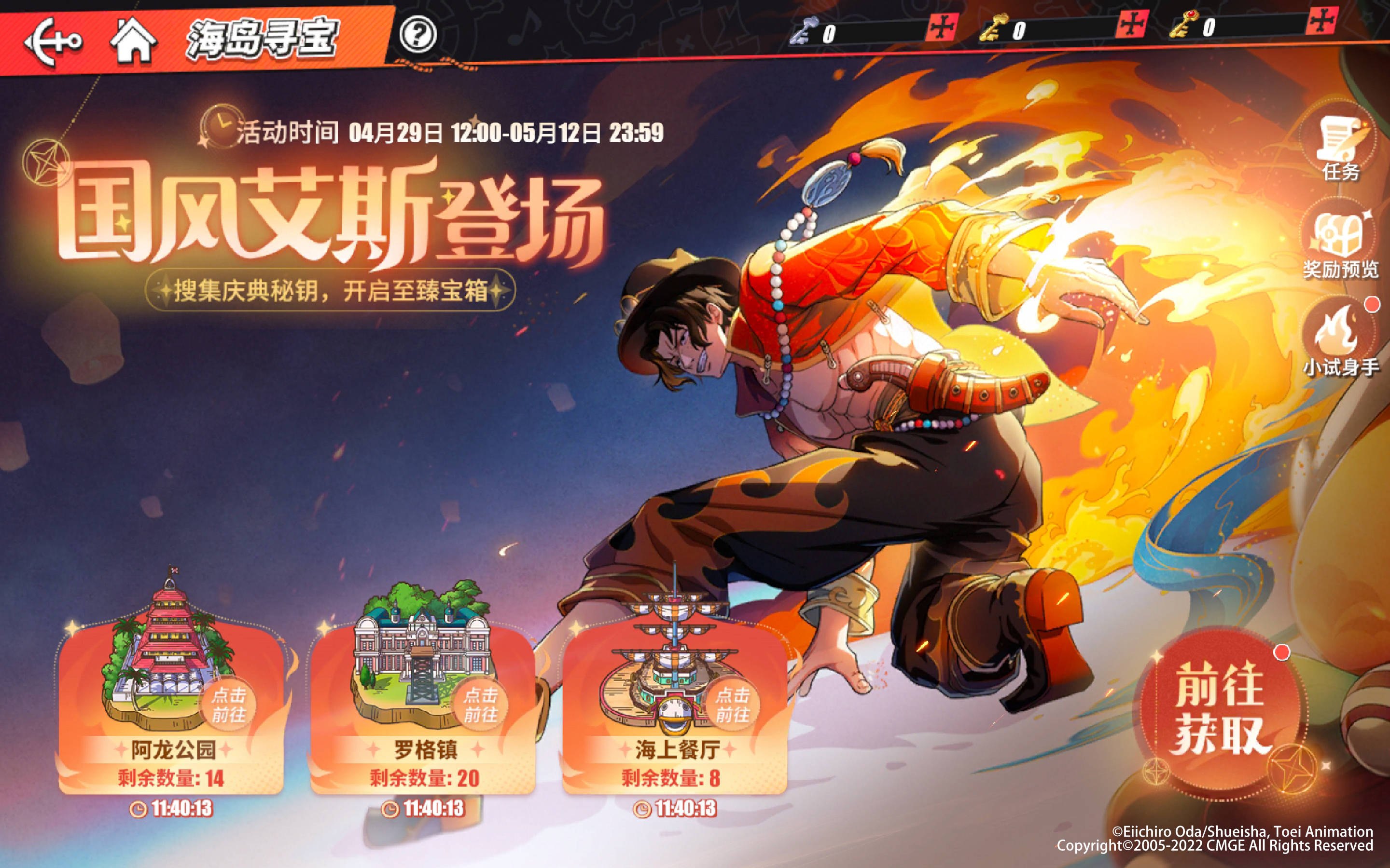 迎接国风艾斯登场,《航海王热血航线》为船长准备了相关主题活动,于4月29日12:00至5月12日23:59间推出【海岛寻宝】活动,船长们参与即有机会获取典藏级国风艾斯伙伴以及国风艾斯碎片,收集满50个即可召唤典藏伙伴国风艾斯。