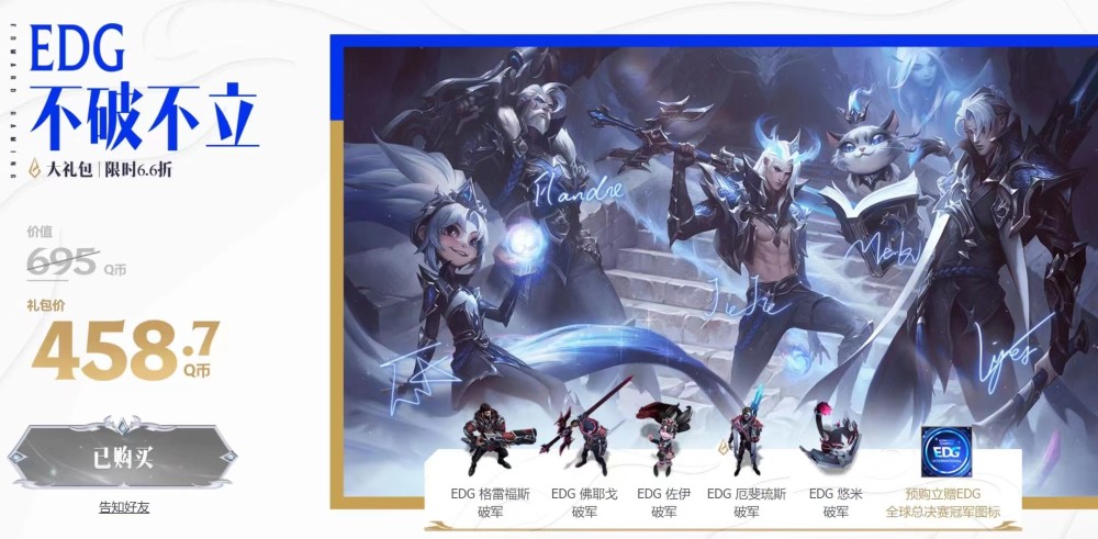 虽然目前EDG冠军皮肤的手感无从得知,但是原画帅气,游戏内细节拉满,任何一个环节都有着EDG元素,同时也有队员独特的想法,就从这几点,就已经足够让粉丝们买单了。据了解,制作EDG冠军皮肤,拳头出动了特效组一半的工作人员,难怪EDG冠军皮肤可以拥有如此多的细节。“帅”就一个字,这是网友们对EDG冠军皮肤的评价。如今EDG冠军皮肤礼包已经上线,性价比拉满。