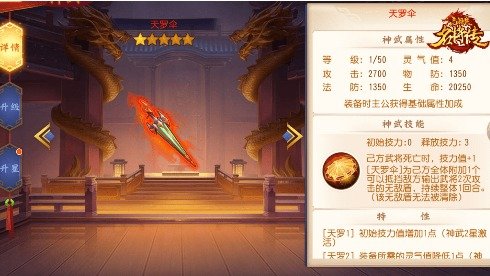 天罗伞以玄铁淬火锻造的薄片组成,需臂力极大才能使用,能抵挡百里夺魄之威。当天罗伞升到五星时,相信主公能发挥出更大的能量!