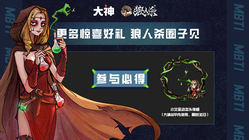 进入大神社区内《狼人杀》圈子完成狼人杀MBTI人格测试,即可领取大神APP内使用的小女巫动态头像框!