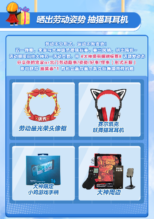 欢度五一劳动节,花式宅家趣事鲜!五一小长假悄然而至,想让宅家也乐趣满满,不如来大神APP参与大神级劳模锦标赛,赢取惊喜假期奖励吧!分享你的花式劳动姿势,争当“劳模”,即有机会领取赛尔凯克妖舞猫耳耳机、盖世小鸡T6游戏手柄、精美周边等缤纷福利欢度五一!
