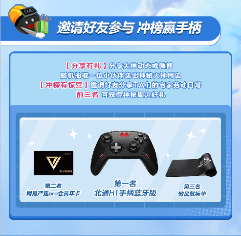 成功邀请好友分享TA们的宅家劳动日常也有机会赢取大神定制款周边!邀请榜前1-3名将分别获得北通H1手柄蓝牙版、网易严选pro会员年卡、傲风鼠标垫!