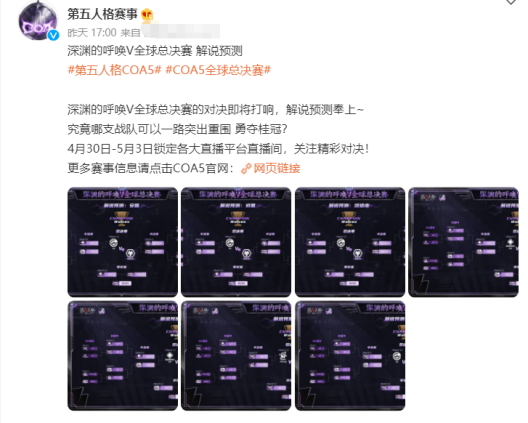 近段时间里面,第五人格的COA5赛事火热的打响了。在经历了半个多月的征程之后,各支队伍也为我们带来了精彩的表现。而最终一轮轮的选拔,淘汰赛也即将在4.30号拉开帷幕,直至5.3号结束,在这个五一小长假里面,相信第五人格的COA5赛事上,各路的职业选手会为我们带来精彩的发挥!