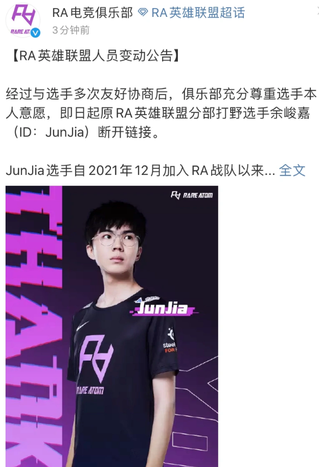 我们LPL的春决已经结束了有一段时间了,现在正是LPL万众瞩目的夏季赛前转会期,无数战队正是在这个时期得到补强拥有了冲击世界赛的资格,当然也有不少战队在这个夏天因为各种原因闹得分崩离析,因此这个时期非常关键,而RA战队便先人一步做出了调整,RA官宣与之前EDG出走的“四皇子”junjia解除合约,这一举动引发了多方关注,因为junjia一直以rank顶尖高手闻名,这让水友们不禁好奇:难道rank真的没有用处吗。