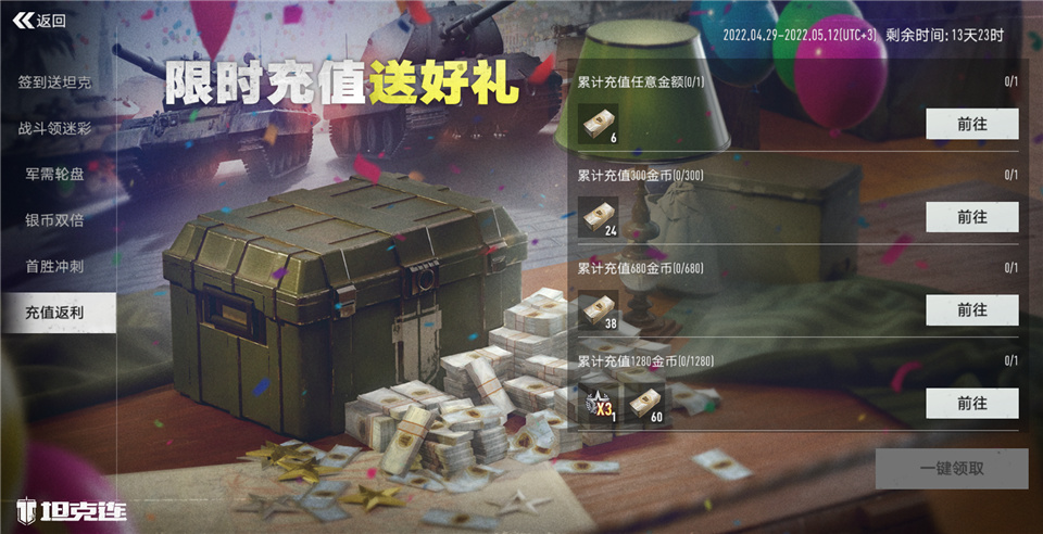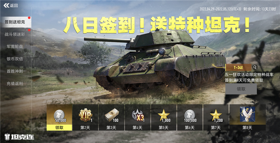 坦克战场因你的到来,而更显精彩!4月29日至5月12日,登录签到福利重磅升级,高级账号、点券、全局经验、2022年五一狂欢活动纪念头像等皆在奖励之列,累计签到满8天,更可免费领取特种战车——T-34E!