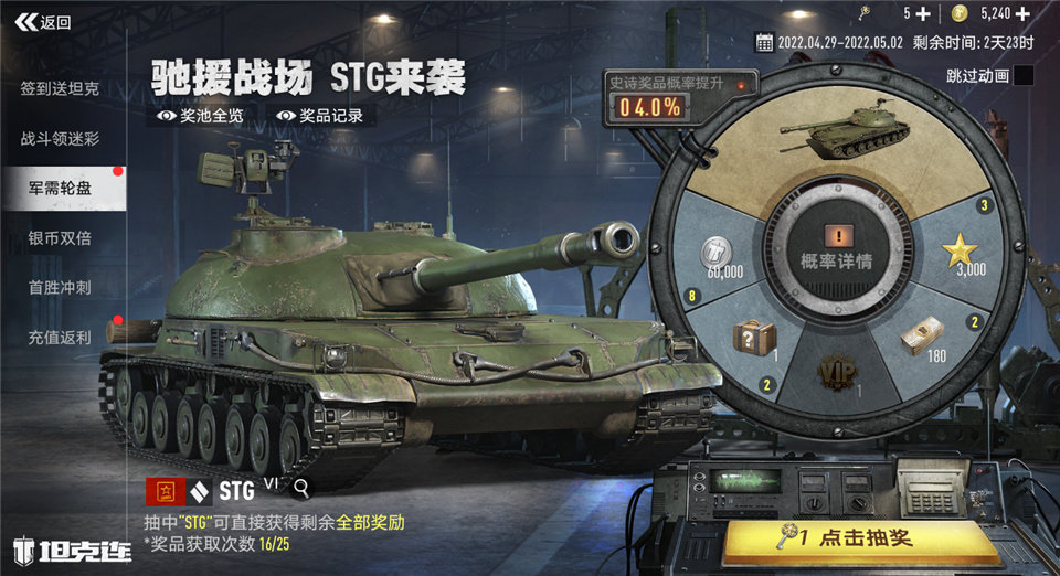 S系VI级中坦“STG”首发登场,并在军需轮盘中等候你的征召!军需轮盘内含有六大类奖励,每次使用轮盘钥匙均可从中随机获取一项奖励,其中STG为史诗级奖励,获取史诗级奖励时,剩余的所有奖励也将一并获取。每类奖励的数量不同,该类奖励领取完后,概率将平均分配至其余类别的奖励中,至多抽取25次,即可将所有奖励收入囊中!