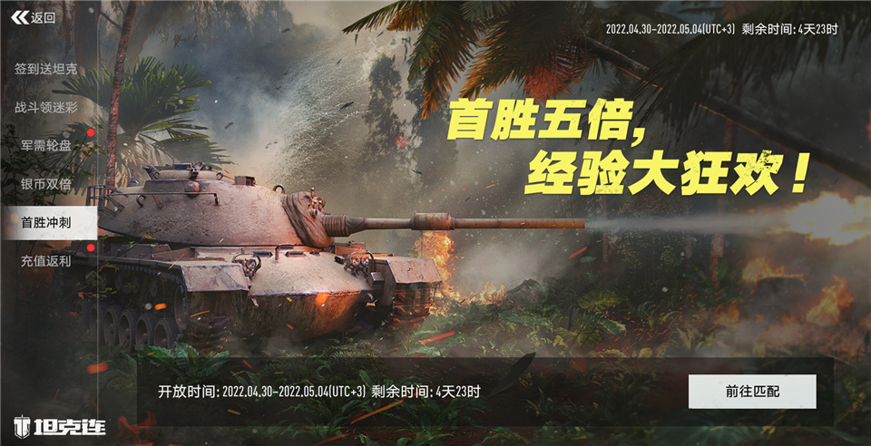 唯有将战斗精神延续,才是对节日最好的献礼!4月29日至5月4日以及5月9日当天,首胜五倍经验将全天候开放,助力玩家们获取更多经验,研发解锁更多全新战车;5月12日前每日12时至13时和19时至21时两个时间段,玩家们驾驶IV级及以上战车参与恢弘的15V15战斗并且经验排名己方前十,即可额外享受双倍银币收益。