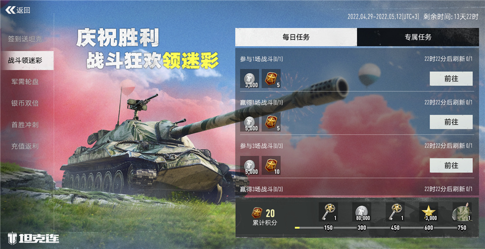 活动期间,每日完成参战或胜利等活跃任务,获取海量银币和胜利积分,累计积分可解锁轮盘钥匙、节日风格限定迷彩等珍贵奖励!