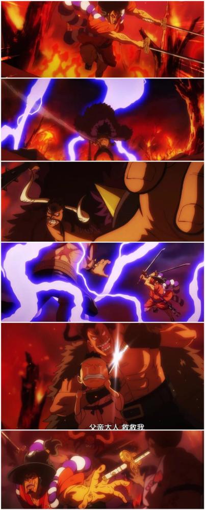 在这决定性的一刻,黑炭大蛇手下易容成御田儿子的样子,让御田受干扰回头,凯多乘机击中御田,一招赢敌。