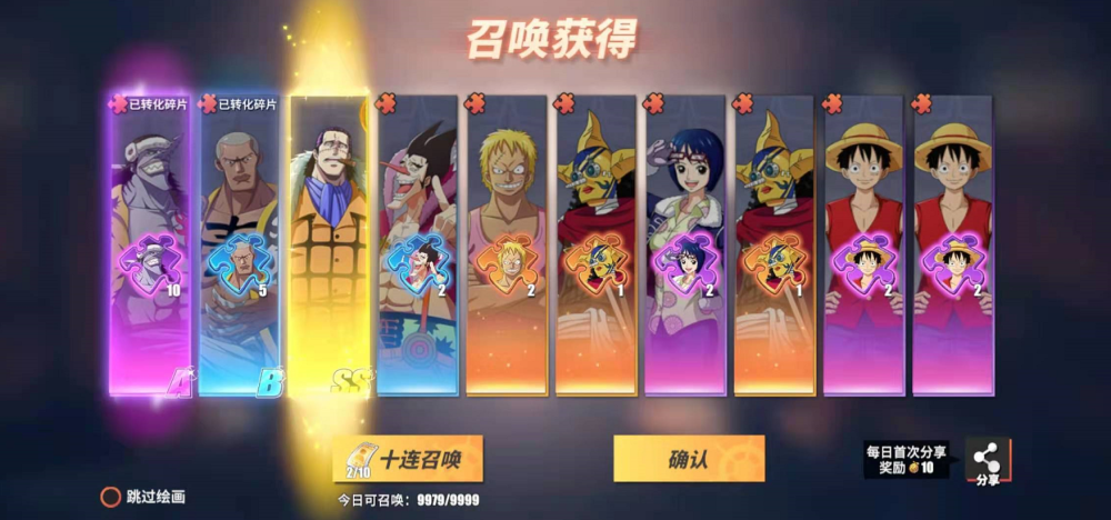 最后来说说《航海王热血航线》里的抽卡,这是在游戏中获取人物的方法之一——抽不到的朋友们也可以靠赞碎片合成。抽卡则必然离不开氪金,一说起氪金,很多玩家都会敬而远之。这也在一定程度上影响了这个游戏的口碑。作为一个偏佛系玩家,看待氪金的态度也很佛系:没时间追求游戏强度的就氪金,有时间追求游戏过程的就随缘。