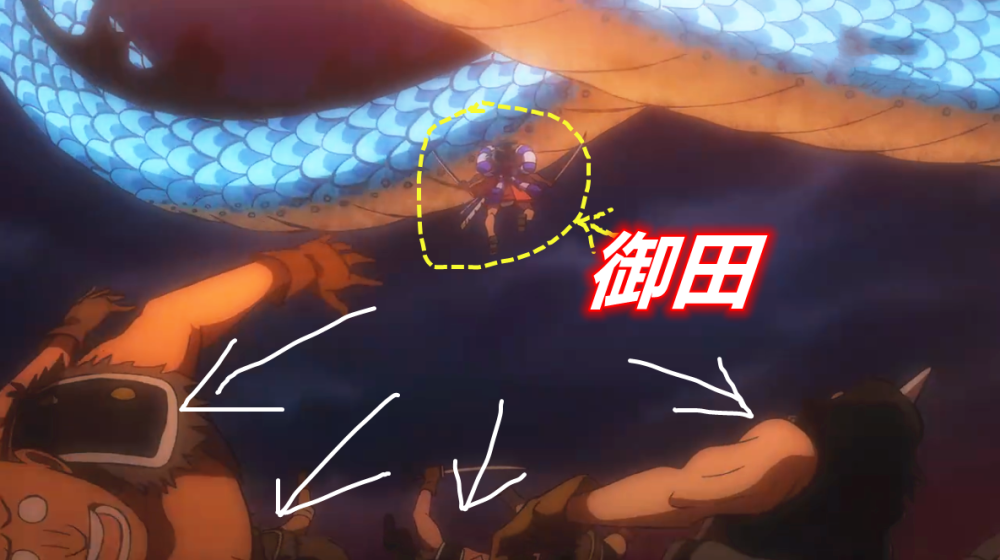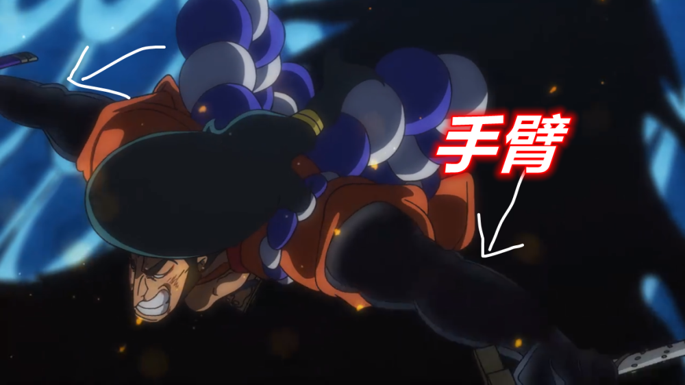 这里还有一个细节,砍完凯多之后,御田的手臂还是黑色的。这里明显不是简单的武装色霸气,因为武装色霸气还无法伤到凯多,想要砍穿凯多坚硬的鳞片,必须要使用“霸气缠绕”才行。回头我们再来简单梳理一下,御田和凯多战斗的时候率先释放了霸王色霸气将杂兵放倒。而这一招已经是霸王色霸气的上级用法,随后使用二刀流砍伤凯多,因此可以肯定,御田在宝刀上面缠绕了霸气。