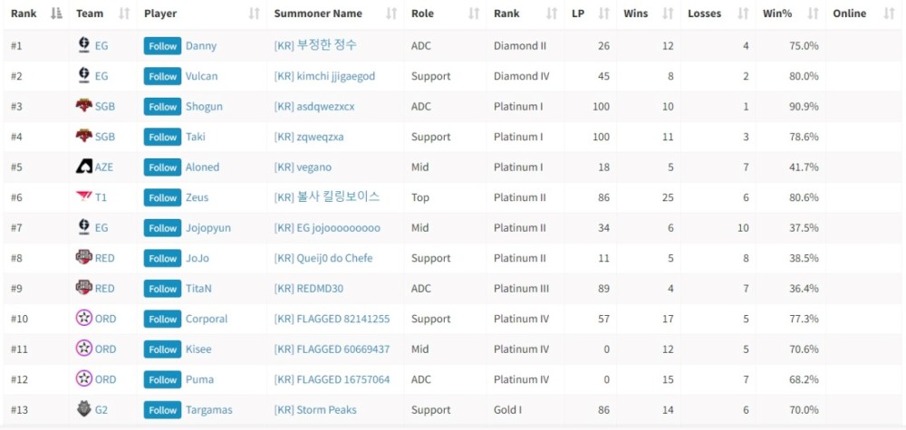 目前选手们都处于爬分阶段,值得注意的是,韩服玩家的水平相比于其他赛区的服务器是要高一些的,因此对于一些职业选手来说,爬分不会那么容易,包括大家熟悉的G2战队中单小帽caPs就在黄金分段中遇到了一些困难。