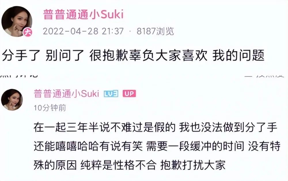 随后suki评论告诉粉丝:在一起三年半分手,说不难过是假的,我也没法做到分了手还能嘻嘻哈哈有说有笑,需要一段时间缓冲。这话显然是在吐槽狼行,suki宣布分手时狼行在直播,他跟弹幕说说笑笑,一点也看不出失恋模样。有弹幕开始猜测:是不是suki遭遇了别的问题,比如恋爱期间狼行找了别的女友?suki还为狼行说话:没特殊原因,纯粹是性格不合。