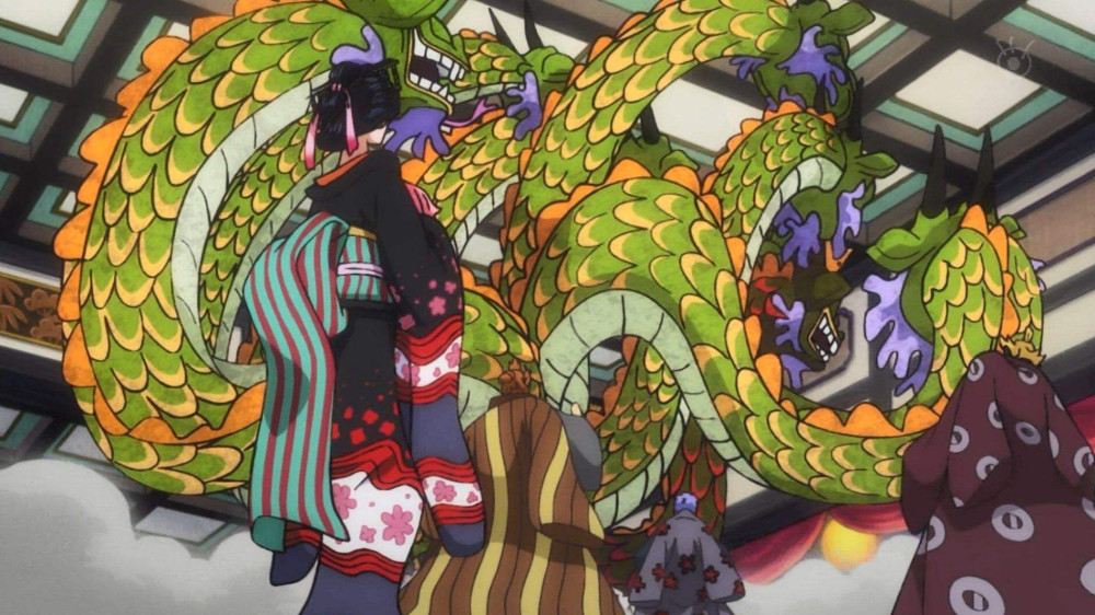 老实说,我个人觉得黑炭大蛇是整个和之国篇中被塑造得最失败的角色,原本以为他会是媲美凯多的大佬,结果每次登场就是被人打被人砍,毫无逼格。而且,幻兽种八岐大蛇这种传说中的果实在他身上也是暴殄天物,全程只有头多这个优点,完全不符合幻兽种的定位。