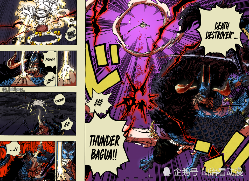 在前两话的扉页小故事中出现了两个黑影,他们入侵了蛋糕岛,蛋糕岛是四皇大妈的大本营。之前很多人猜测是黑胡子去偷家,这个猜测也没有任何根据,黑胡子是唯利是图的人,蛋糕岛根本没有他想要的东西,说他会介入和之国战争还有可能,毕竟凯多的鱼鱼果实非常强大。