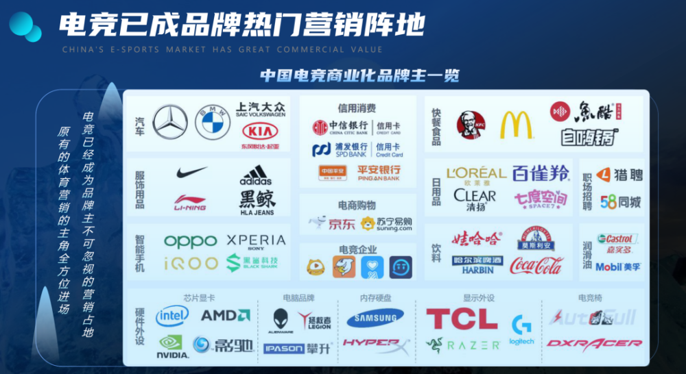 用户基数的增长为电竞产业带来了清晰且可开发的商业价值。无论是电竞赛事、电竞战队、还是直播平台等等,都成为品牌进行营销推广的新兴场域。