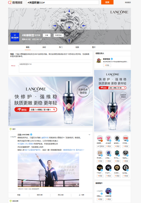 “泛电竞”产业的普适性是很强的,几乎所有面向年轻消费群体的品牌都能够在电竞领域发现营销的切入点。兰蔻就洞察到了自身消费群体与电竞用户的重合,在英雄联盟S11赛事期间进行了内容的联动,通过聚焦电竞用户的熬夜习惯,将自身产品在电竞群体中的优势剥离出来,完成了美妆与电竞的“有机结合”。