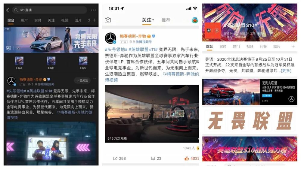 谈到借势电竞营销,奔驰也是一个绕不开的品牌。2017年,奔驰提出了“无畏造英雄”的营销口号,并从S7赛季开始,全程赞助LPL,成为LPL首席合作伙伴,一做就是五年的时间,这让奔驰成为了品牌借助电竞赛事进行营销的代表。